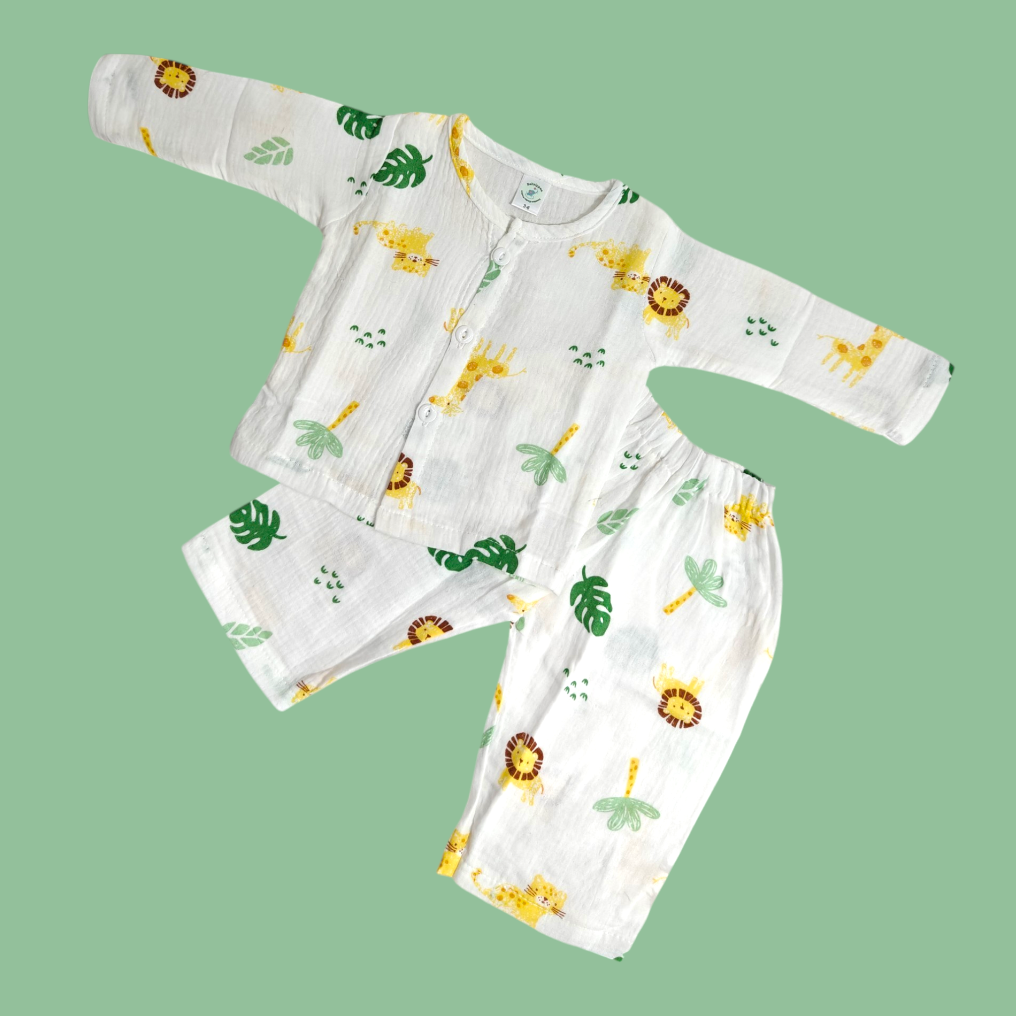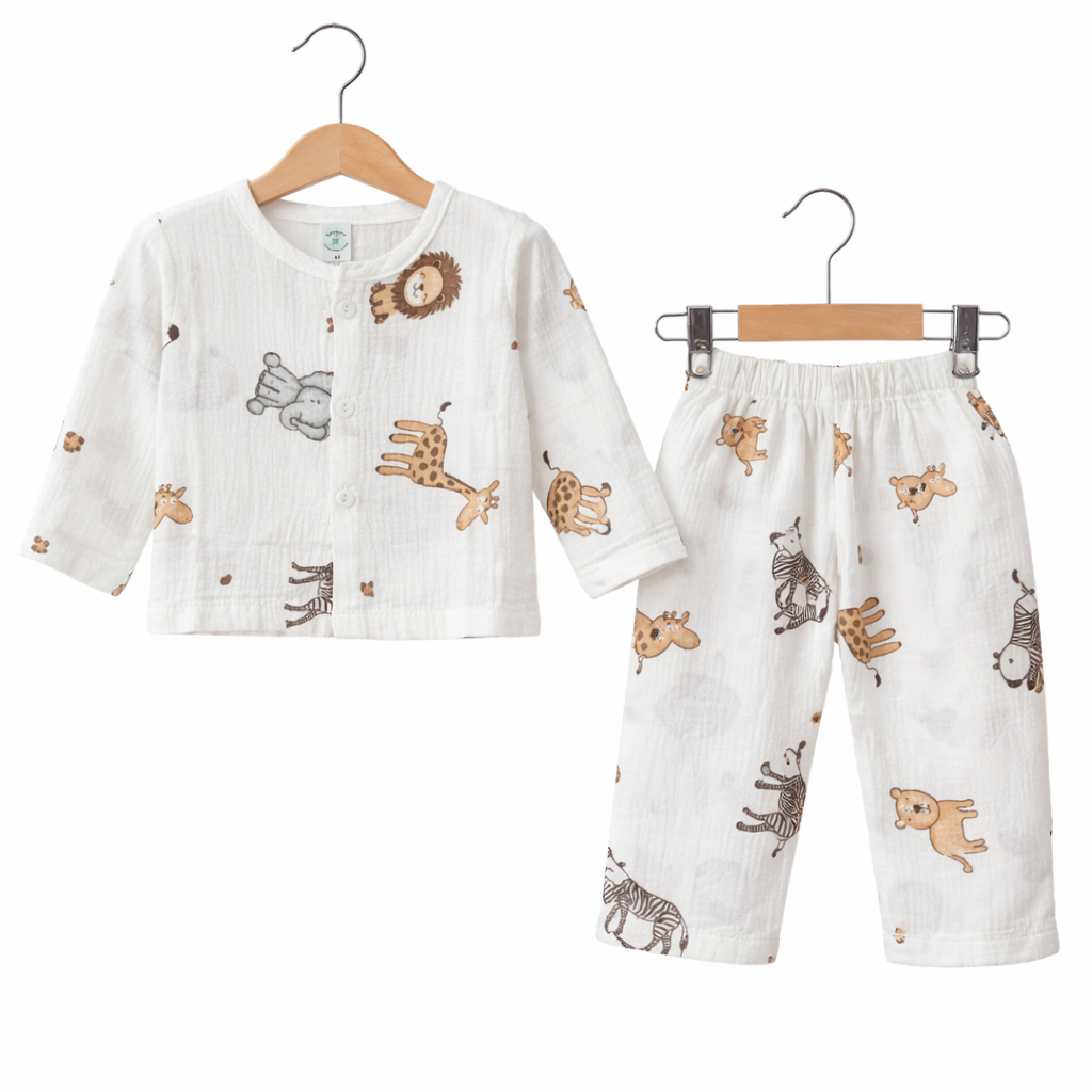 ANIMALS PRINT BUTTON-UP MUSLIN NIGHTSUIT - WHITE